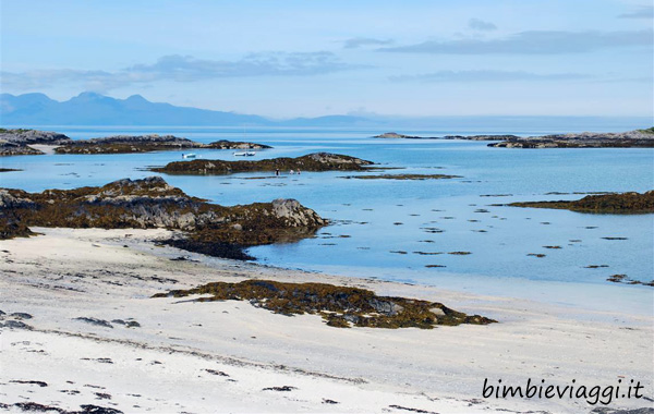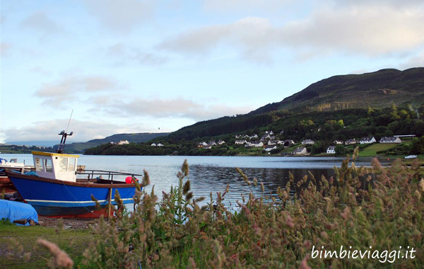 Attratti dai racconti di viaggio letti online ci siamo poi diretti verso l’ISOLA DI SKYE, passando da MALLAIG. L’atmosfera del porto dei paesi nordici è sempre affascinante, e non abbiamo resistito all’idea di imbarcarci per un’isola, seppur con l’incognita del pernottamento. Avremmo in realtà desiderato spingerci verso le isole più selvagge e meno battute dal turismo, ma dormire sull’isola di Skye ci è sembrato un buon compromesso. Qui abbiamo girato un po’ più del solito per trovare un B&B che non costasse troppo, ma alla fine abbiamo trovato la sistemazione più economica di tutto il viaggio (ospitati da una signora isolana, a Portree. Sistemazione molto caratteristica, ma spartana e poco adatta agli schizzinosi!) ed è andata benissimo. Non essendoci un lettino per bambini la signora ci ha messo a disposizione una camera tripla così Francesca ha dormito con la mamma nel lettone e il papà in un lettino singolo.