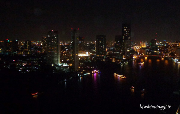 …Mi viene un’idea: perché non concludere in bellezza andando a cena sul grattacielo più alto di Bangkok, il Bayoke sky, che è abbastanza vicino? La proposta viene accettata, ma quando arriviamo, il costo della cena è molto più alto rispetto a quello che è indicato sul web, ma si puo’ comunque salire all’ultimo piano del grattacielo e godere del paesaggio dalla piattaforma ruotante, con incluso nel biglietto un drink! E allora si va! Il panorama è veramente entusiasmante, ti accorgi di quanto Bangkok sia enorme e sicuramente è un bel modo per trascorre l’ultima sera..