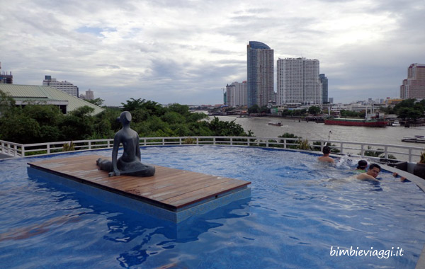 Volevo che mia figlia e mio marito avessero un primo impatto davvero sorprendente con questa città molto particolare e quindi ho prenotato una grand room del lussuoso Chatrium Riverside hotel, un grattacielo sul fiume, per la modica cifra di 100 euro in tre! (in italia credo che sarebbe costato 4 volte tanto). Non vi dico l’entusiasmo di Giada all’arrivo in hotel e alla vista dalla nostra bella camera al 31 piano, 60 mq con soggiorno e angolo cottura, vetrata panoramica sullo skyline della città, e favolosa piscina sul fiume vista città, al IV piano!