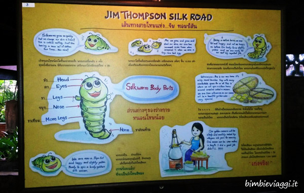 Al termine, capito come si fa e i prezzi, fermiamo un altro tuc tuc, contrattiamo e ci facciamo portare ad uno uno dei must per chi visita Bangkok: la Jim Thompson House, ovvero una casa tipica thailandese in tek diventata un museo, costruita da un architetto americano che innamoratosi del paese, riportò in auge il commercio della seta in Thailandia. Oltre ad essere molto bella la costruzione ed essere inserita in un rigoglioso giardino tropicale, durante la visita guidata, si trovano dei pannelli che spiegano la storia del baco da seta e tutto il ciclo: Giada è molto interessata e alla fine è entusiasta di questa visita.