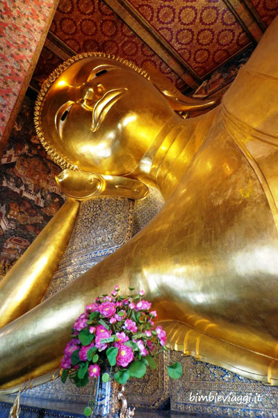Poi ci spostiamo nell’adiacente Wat Pho, dove vediamo il famoso enorme buddha sdraiato lungo 45 metri, alto 15, che mi è piaciuto tantissimo, oltre ai tanti chiostri e pagode con altre 1000 statue di Buddha.