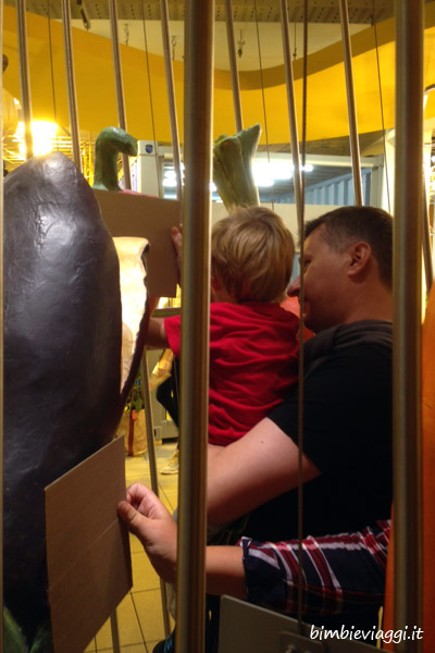 Noi abbiamo saltato i video introduttivi, per non annoiare da subito Chicco, che invece ha apprezzato la riproduzione a grandezza naturale degli animali, il mulino ed il passaggio nel vaso gigante poiché ci si trova sulla testa un video che dà l’impressione abbastanza realistica di ciò che viene versato nel vaso (acqua, vino, succhi, legumi, frutta secca…).