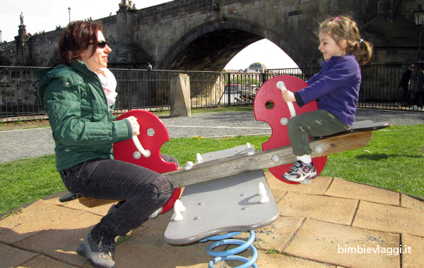 Dopo pranzo, stavolta in ristorante, l’abbiamo portata al parco giochi; si trova vicino alla Pissing Fountain (altra scultura di Cerny), appena sotto Ponte Carlo.
