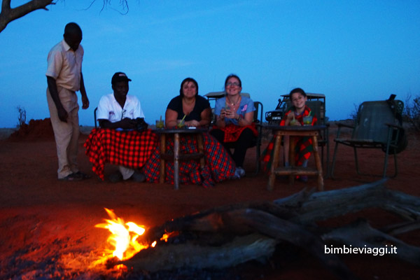 L’aperitivo al tramonto organizzato dal Satao Camp: falò acceso in mezzo alla savana, seggiolina fronte tramonto, coperta Masai per scaldarsi, bevanda a base di vodka e miele, e tutto attorno il nulla, condito solo da quel piccolo brivido che ti corre lungo la schiena al pensiero di chissà quali animali ti stanno passeggiando attorno (ovviamente eravamo circondati da silenziosi guardiani!).