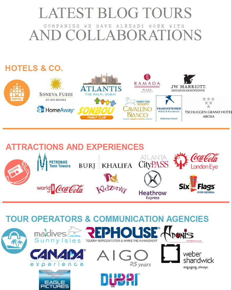 Questa pagina è in continuo aggiornamento e riporta solo una piccola selezione delle nostre collaborazioni. Per ricevere il media kit completo, scrivere all’email bimbieviaggi@gmail.com