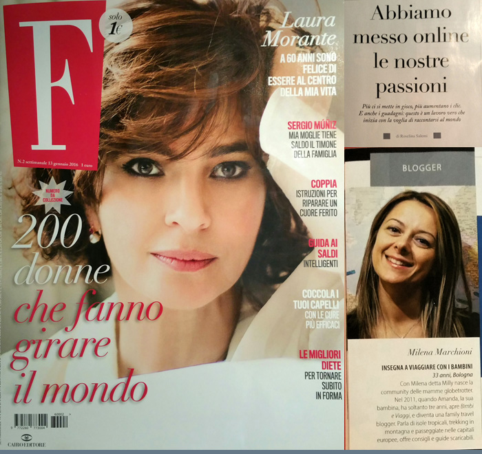 - 2 articoli sul settimanale F: 2016 Milena Marchioni citata tra le 200 donne che fanno girare il mondo e 2017 Milena Marchioni citata tra le 5 travel blogger da seguire