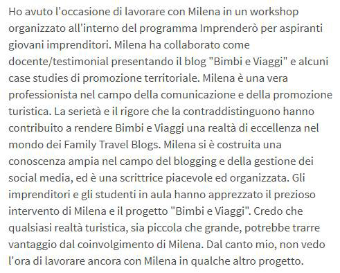 Partecipo anche a progetti formativi come docente sui temi del travel blogging, community building, social media strategy, comunicazione digitale, marketing territoriale e promozione turistica soprattutto in chiave family.
