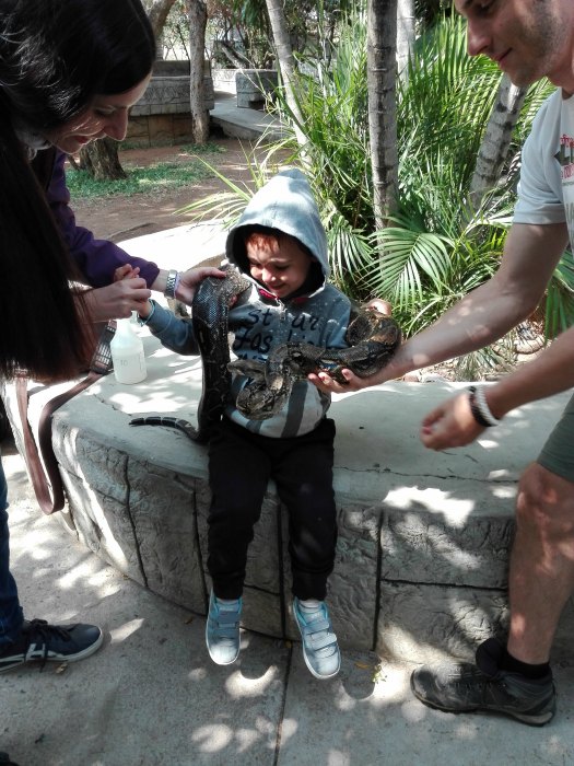 Il giorno seguente siamo stati al Kinyonga Reptile Park, dove siamo stati accolti da un simpatico struzzo! All’ingresso Alberto non ha pagato, anche se sul sito c’era scritto che dai 4 anni in su si pagava il ridotto. La ragazza alla biglietteria ci ha chiesto se volevamo essere seguiti gratuitamente per la visita da un volontario italiano, che fortuna! Tommaso è un ragazzo milanese che ha deciso di passare qui un mese come volontario. Il parco si occupa di raccogliere rettili abbandonati, feriti o sequestrati da bracconieri. La visita ci è piaciuta molto e Alberto ha gradito moltissimo la spiegazione in italiano che ha consentito di coinvolgerlo totalmente, infatti il povero Tommaso è stato subissato dalle sue domande! Ciliegina sulla torta è stata la possibilità di toccare e tenere in braccio un boa enorme, Alberto era emozionatissimo, anche se ho dovuto aiutarlo a tenerlo perché il serpente era pesantissimo!