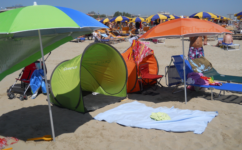 Spiaggia e mare nella nostra Riviera Romagnola sono poi decisamente troppo affollati per i miei gusti: l’orizzonte non è in alcun modo visibile, se non durante un bagno al largo, e per passare dalla spiaggia al mare servirebbe un semaforo pedonale, per non rischiare di pestare i piedi alle centinaia di persone che passeggiano sul bagnasciuga. Non parliamo poi di quegli annunci che senti fare dagli altoparlanti dei vari bagni, tra bambini che si sono persi e genitori che hanno perso bambini…e ogni volta ti prende un morso allo stomaco, perchè ti rendi conto che è questione un attimo: ti distrai, il pupo sparisce nella folla e tu muori dentro perchè ti passa di tutto per la testa…