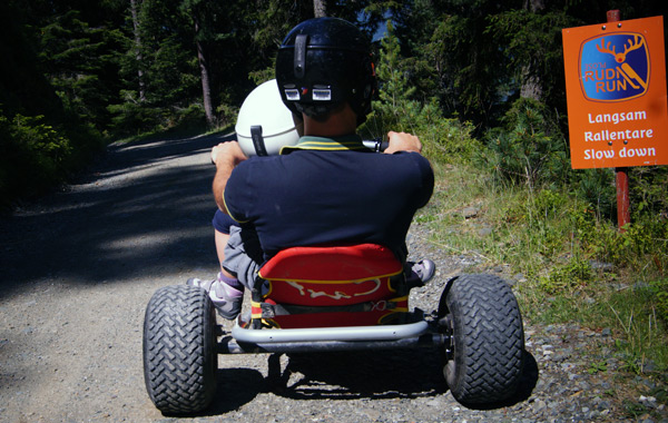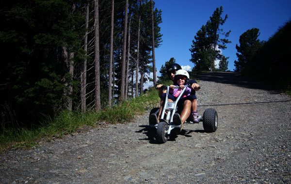 Le Mountaincart sono speciali gocart su tre ruote, senza pedali, con grandi gomme (e ottimi freni a disco!) coi quali è possibile percorrere la strada sterrata verso S. Andrea (che in inverno è la pista da slittino RudiRun): 10km in discesa a dir poco emozionanti, fra boschi e panorami mozzafiato sulla vallata sottostante!!!
