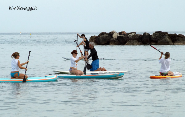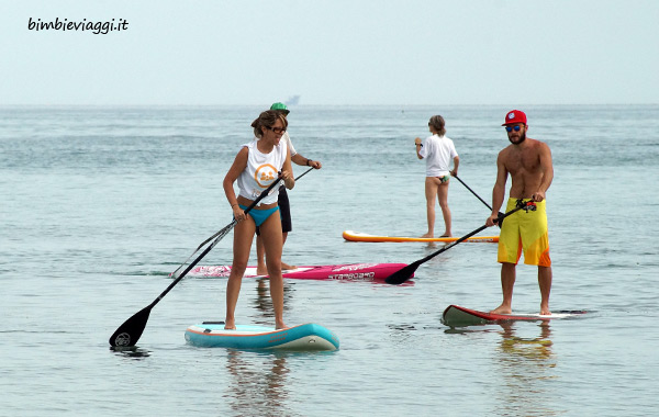 In realtà, le prime cavie di questo esperimento siamo state noi mamme. Le tavole stese sulla spiaggia di Bellaria Igea Marina e noi tutte a fare foto e a prendere appunti, mentre Roberto Mandoloni (campione italiano e istruttore di SUP) ci raccontava la storia di questo sport “esotico”.