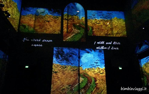…e tutto intorno cominciano a scorrere le immagini, alcune anche con effetti speciali come uccelli che si animano, pale dei mulini che si muovono sulle pareti, sul pavimento, sui bassorilievi delle finestre… ognuna diversa, con quei colori dirompenti e quelle emozioni che sembra che escano e ti arrivino dentro..il tutto accompagnato da brani di musica legati alle opere o ai luoghi dove sono ambientate e dalla proiezione di frasi significative o estratti di lettere scritte dal pittore, di una intensità molto toccante..
