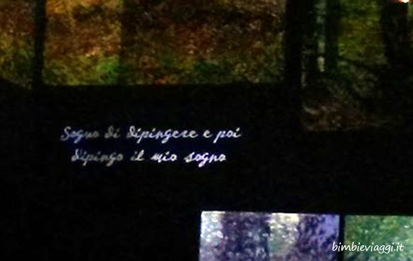 Il ciclo completo della proiezione dura circa mezz’ora e ripercorre cronologicamente la vita dell’artista… noi l’abbiamo visto 2 volte e mezzo: la prima volta io mi sono concentrata sulle immagini, la seconda sugli scritti, poi ho voluto cambiare posto e prospettiva… e sarei voluta rimanere ancora, ma per quanto la mostra sia piaciuta a Giada, dopo il secondo giro, aveva una gran voglia di uscire… del resto, era una bellissima giornata! 🙂