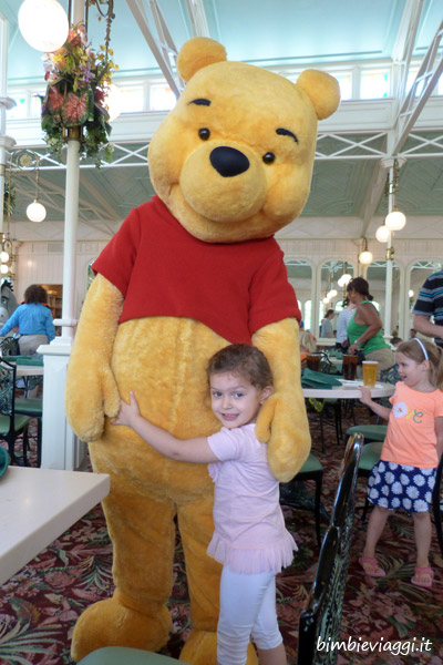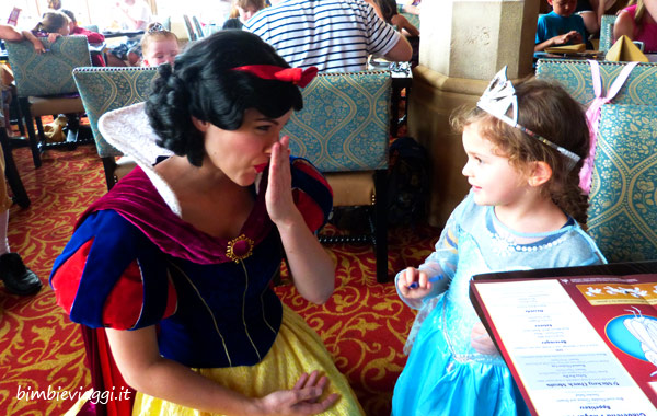 …Soprattutto quando è arrivato il momento della super sorpresa che le avevamo preparato dall’Italia (prenotando sempre direttamente dal sito di Disneworld)… Lei è in fase principesse a gogo, anzi forse – adesso che ci penso- lei è proprio convinta di essere una principessa (ohcavolo!). Quindi, una volta arrivati al castello (che, a differenza di quello di Parigi, è agibile!) l’abbiamo vestita con il suo travestimento da Elsa (rigorosamente portato dall’Italia, prelevato direttamente dal suo armadio) e portata a pranzo con…nientepopodimenoche…tutte le sue amate Princesses al Cindarella’s Royal Table….e ragazzi abbiamo pure mangiato divinamente!!!