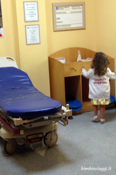 Una sorta di città a misura di bimbo, con tutti i mestieri e i travestimenti (ed è nota la mania di mia figlia di cenare ad esempio vestita da veterinaria per poi andare a dormire vestita da ballerina di flamenco!) dal medico di pronto soccorso con tanto di emergenza e lastra, alla banca, al veterinario, pescatore e ancora vigile del fuoco, comandante di nave da crociera Carnival, ballerina di hula e (per “giocare in casa” visto la professione di papà) direttrice di ipermercato e cassiera!