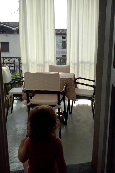 Mentre il papy scarica le valigie e sistema l’auto, io e Caterina  seguiamo la gentile e simpatica proprietaria lungo una ripida scalinata della storica palazzina. Il nostro appartamento è ampio, spazioso, luminoso, pulito e attrezzato di ogni confort e con una bellissima e luminosa terrazza, riparata dal sole da candide tende, arredata con tavolini e sedie e ravvivata da grandi vasi di piante aromatiche.
