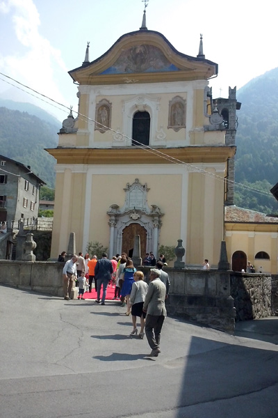 Il centro di Rino è piccolissimo, poche case e una chiesa alpina, tutto arrampicato sulle pendici dei monti, stradine in salita e altre in discesa che spuntano dietro i vari angoli, poche persone affacciate ai balconi incuriosite dall’insolito evento. La minuta chiesa alpina di Sant’Antonio Abate è bellissima e molto curata anche all’interno, una chicca!