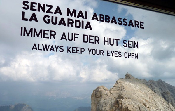 Splendide vetrate che consentono d’ammirare uno dei paesaggi più belli del mondo, recano scritte che inducono alla riflessione e ci prendono per mano nell’intento di abbattere la poca conoscenza degli avvenimenti di questi luoghi.