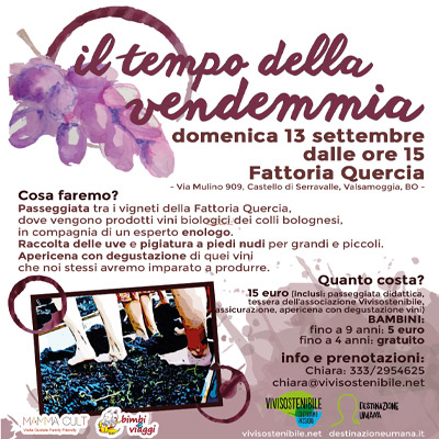 Voglia di vendemmia con i bambini, di passeggiate a piedi nudi e di assaggi di ottimi vini? Domenica 20 settembre, alle ore 15 a Castello di Serravalle, in provincia di Bologna, ci pensano gli amici di Vivistostenibile. Ecco tutti i dettagli raccontati da Chiara.