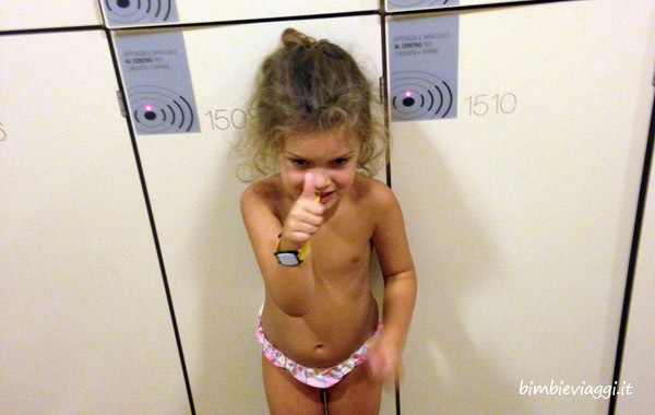 Una volta entrati in biglietteria si è muniti di un comodissimo braccialetto elettronico, subito soprannominato da Bea “braccialetto del potere”: con esso infatti si può aprire l’armadietto negli spogliatoi (davvero puliti e dotati di tutto, fasciatoio e box compresi), entrare nell’area SPA e soprattutto farsi addebitare consumazioni al bar ed acquisti. Un cosa davvero comodissima, perché altriementi nei parchi acquatici c’è sempre l’incubo di dove mettere i soldi!