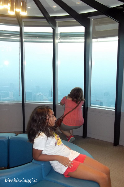 Appena si spalancano le porte dell’ascensore, la meraviglia e il brivido hanno la meglio. La città è ai nostri piedi, il vento fischia e sembra a volte far vibrare l’intera struttura. L’altra torre si erge accanto a noi altrettanto imponente e guardare giù non è facilissimo, perché il senso di vertigine è alto.