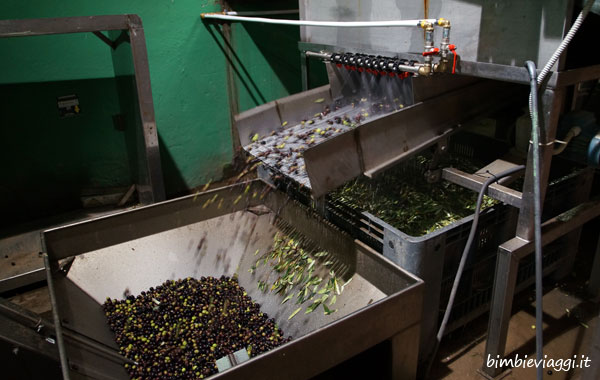 Dopo essere stata raccolta dagli alberi, l’oliva viene scaricata all’interno di un macchinario che le toglie le foglie e la spinge attraverso tutta una serie di passaggi che la trasformano prima in sansa e poi, finalmente, in olio.