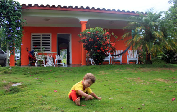 Con Violante annusiamo le piante, i fiori, rincorriamo uccellini e pulcini, facciamo la conoscenza ora di una ranocchia ora di un geko. Ci riempiamo delle piccole meraviglie che il giardino offre, e un po’ più in là, sul retro della casa, che si apre su uno spettacolare panorama, ammiriamo estasiati i mogotes – curiose formazioni calcaree che ricordano degli enormi panettoni ricoperti di vegetazione – e i loro cappucci, ora nascosti dalle nubi, che poi lasciano posto a un sole arancione per un tramonto rosso fuoco.