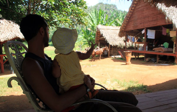 Per rallentare ancora di più il ritmo del viaggio – se possibile – scoprire una delle aree naturali fra le più verdi, incantevoli e protette dell’intera Cuba, dondolarsi su una sedia a dondolo sotto il portico di una casa tradizionale fumando un sigaro, le cui foglie di tabacco vengono coltivate numerose nella zona – mentre Violante gioca con le figlie dei contadini che ci hanno invitato per un puro – degustare ottimi caffè i cui grani provengono direttamente dalle piantagioni della valle – mentre Violante si rinfresca con succo di piña fresco – farsi coccolare dalla splendida Marta e desiderare di non lasciare mai la sua casa, iniziare la giornata con splendide colazioni ammirando un panorama da favola, e salutare il giorno cenando sotto le prime stelle, ammirando gli splendidi mogotes che vengono pian piano inghiottiti dal buio, fare escursioni a tre a cavallo per la valle, scoprire che i cinesi tempo fa arrivarono anche a Cuba e che la nostra guida ne è divertito discendente, avventurarsi per grotte – Violante aggrappata al collo – scoprire un’isola e un mare da sogno, e dire sì, la prossima volta ci fermeremo qui alla Robinson Crusoe…