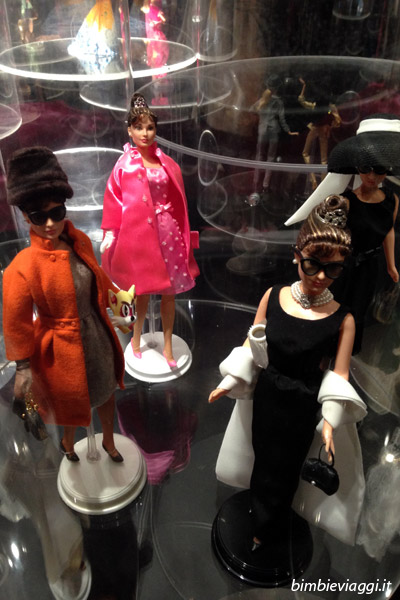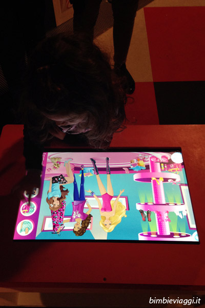 Nelle sale infatti, sono presenti diversi touch screen sui quali è possibile vestire e svestire la bionda, oltre ad alcuni telefoni fucsia (mica un colore a caso eh) posizionati ad altezza bimbo, che invitano le piccole a cercare pezzi storici o a giocare con le proprie mamme, oltre a fornire informazioni chiare e semplici.