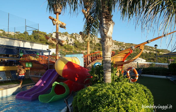 Poi c’è una piscina più piccola con acqua bassa, perfetta per i piccolissimi, con un galeone da cui ci si può tuffare attraverso gli scivoli.