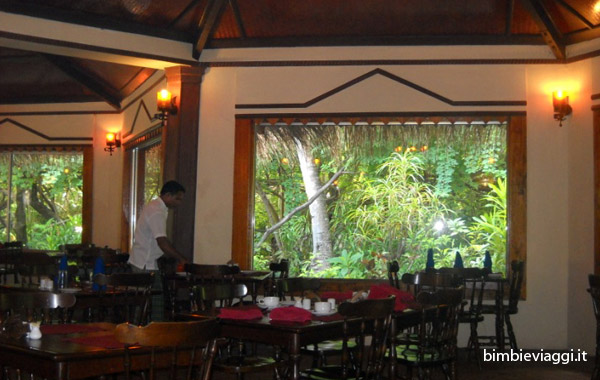 Il ristorante non è all’aperto, sembra un’osteria, è poco luminoso, ma dalle sue finestrone si vede la giungla attorno..