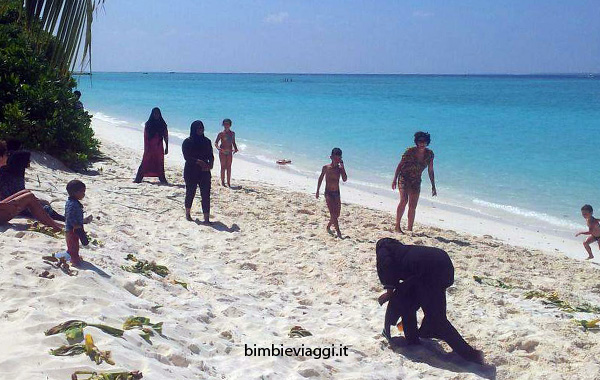 Altro esempio il decoro richiesto nell’abbigliamento. E’ facile vedere le donne fare il bagno con il velo, e gli uomini comunque con bermuda e maglietta: difficilmente vedrete un uomo a torso nudo se non in alto mare, o comunque su una lingua di sabbia lontana dai centri abitati. Alle turiste non è certo richiesto il velo, ma comunque il bagno in costume è limitato a delle spiagge ben specifiche, di solito riservate apposta in ogni isola. E va da sé che non si può circolare in costume da bagno dalla spiaggia alla guest house!
