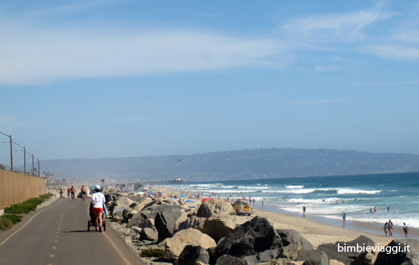 Dopo un pranzo decisamente poco sano (patatine in busta e doppio sandwich al formaggio!) riprendiamo a pedalare fiduciosi di raggiungere Santa Monica… Ma circa a metà strada rinunciamo perché eravamo stanchi, soprattutto mio marito che trainava 20 kg di bambini oltre al peso del carretto! Decidiamo quindi di tornare indietro e fare una passeggiata sul molo di Redondo.