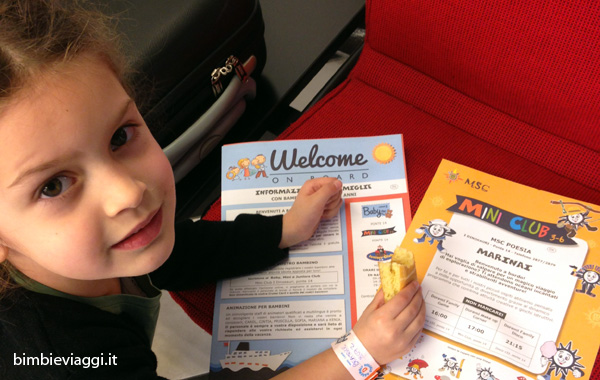 Dopo il check in in porto, dopo la foto di rito con il timone, ecco Bea accolta in sala d’attesa per l’imbarco dal gruppo di animatrici che subito si sono presentate, offrendole un succo, armandola di braccialetto di riconoscimento (o del “potere” come chiama lei i braccialetti di villaggi ecc) con nome, numero di cabina e zona di ritrovo nel caso di evacuazione, e consegnandole il Daily (il famoso programma che ogni giorno viene lasciato sul letto e di cui molti crocieristi e non fanno collezioni) ma in formato bimbo.