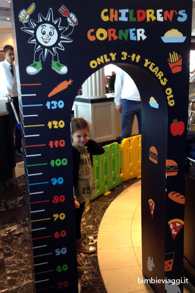 I club sono divisi in base all’età: BABY (under 3), MINI ( 3-6) e JUNIOR ( 7-11). Ogni club ha una propria struttura ed un proprio programma di attività e laboratori, alcuni da fare in famiglia. Tutto è riportato giorno per giorno sul Daily. - A TAVOLA: bellissimo il Kid’s Corner al buffet con ingresso dedicato a chi è sotto i 130 cm d’altezza e cibo ad hoc per mini palati. Al ristorante alla carta un mini menù con i fiocchi, con proposte del giorno e specialità sempre presenti, assieme ai prodotti Chicco per i più piccoli.