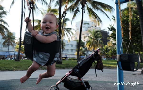Miami beach oltre alla splendida spiaggia e mare limpidissimo offre una meravigliosa passeggiata lungomare (a piedi, in bici, roller skate o passeggino nel nostro caso) si arriva fino a Lummus Park dove ci sono giochi per bambini (la prima altalena per Olivia).