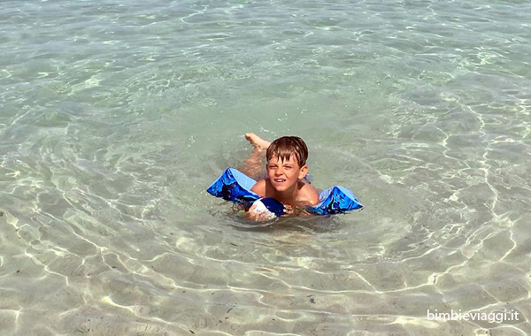 La nostra referente l’aveva chiamata “piscina naturale” e non aveva assolutamente torto; il bagnasciuga digradava quasi impercettibilmente per cui l’acqua restava bassa per un bel tratto, adatta proprio per un bambino, che infatti ci ha sguazzato dentro dal primo momento che ci abbiamo messo piede fino al minuto prima di venir via (salvo il momento del pranzo ed il tentativo di trattenerlo sotto l’ombrellone tipico di paglia durante le ore più calde).