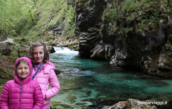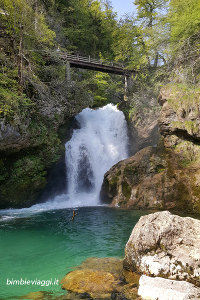 Il giorno seguente ci siamo invece organizzati per visitare le gole di Vintgar, una delle cose che più ci è piaciuta nella zona! La partenza si trova a circa 4 km a nord di Bled (noi con il navigatore non abbiamo avuto problemi a trovare il sentiero). Per poter accedere occorre pagare un biglietto minimo direttamente all’ingresso. La passeggiata, solo andata, è lunga circa 1.6 km ed è molto facile da percorrere anche con i bambini perché è praticamente tutta pianeggiante: nonostante questo, per chi avesse bimbi piccoli consiglio il marsupio o lo zaino piuttosto che il passeggino. Si costeggia il corso del fiume Radovna che lungo il percorso forma cascate e rapide dai bellissimi colori verdi azzurri mentre nelle pozze trasparenti si possono vedere i pesci che nuotano.