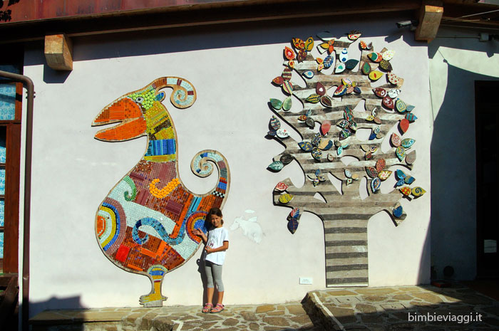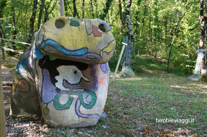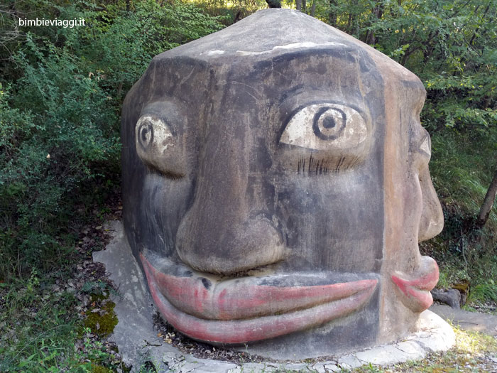 Non sto parlando di giocattoli, ma di vere e proprie sculture, in pietra o legno, a tratti seriose, a tratti fanciullesche, tutte sicuramente curiose e trasformabili in attrazioni per i bimbi, frutto della creatività della famiglia Fo. Non mi sarei stupita se avessi visto sbucare Bianconiglio tra la folta vegetazione…