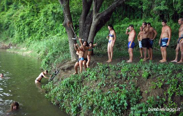 Arriviamo in un punto dove la zattera accosta e su un ramo di un albero è appesa una liana: chi vuole puo’ tuffarsi dalla liana nel fiume!!
