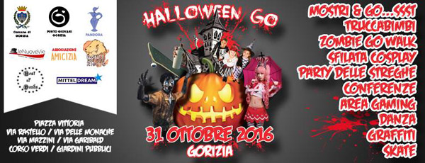 A Gorizia dalle ore 15.00 in poi c’è la festa horror con balli, truccabimbi, intaglio della zucca, tornei di gaming raduno cosplay, streetart, maid cafè e zombie walk ma anche conferenze (le vie interessante saranno Via Garibaldi via Mazzini via delle Monache via Rastello Piazza Vittoria, Corso Verdi e Giardini Pubblici):