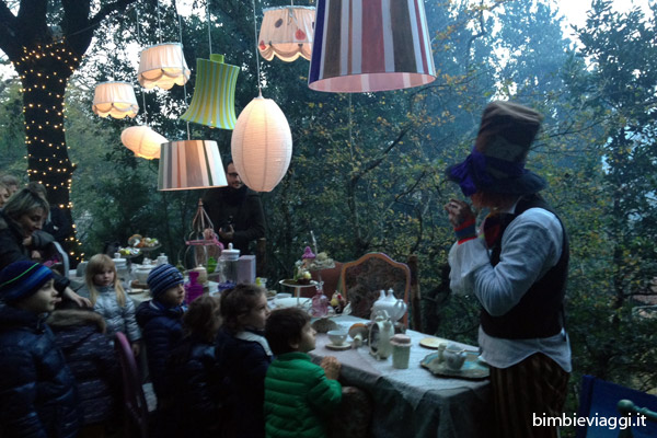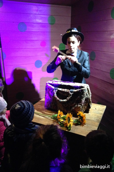 Si tratto di una sorta di percorso tra i personaggi in carne ed ossa delle più belle fiabe di sempre (tra l’altro tutte le preferite della nostra #laBeawithtrolley), un’avventura tra meravigliose scenografie ed ambientazioni (il tavolo del Cappellaio Matto è il non plus ultra). I protagonisti sono loro, i bambini magici, che dovranno riportare la bacchetta che risveglia le favole alla Fata Turchina. E la bacchetta magica, come racconta la nostra Bea, ha super poteri e fa diventare tutti buoni, compresi la matrigna Grimilde, il Lupo e Capitan Uncino. Ma la preferita di Beatrice è stata Mary Poppins che a suon di “come è bello passeggiar con Mary” (per mano “nientepopodimenoche” proprio alla nostra bimba) cerca nella sua famosa borsa la chiave per aprire la porta di Cappuccetto Rosso. Ora non vi racconto più nulla, vi lascio la sorpresa, ve lo lascio godere insieme ai vostri bimbi, come noi abbiamo partecipato con Bea saltellante e felicemente incredula.
