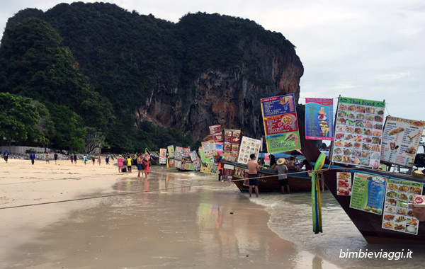 E’ meta di gite e le longtail che vanno e vengono possono diventare fastidiose, ma se si supera la parte centrale della spiaggia, più affollata, si può essere più tranquilli. In alternativa è da visitare la mattina presto o il pomeriggio tardi: non ci sono ombrelloni, bisogna accaparrarsi l’ombra di un alberello. Questa spiaggia regala paesaggi indimenticabili. Lungo la spiaggia ci sono numerose long tail che fungono da chioschi di cibo e sono state per noi una piacevole scoperta: il pesce e la frutta qui sono superlativi .