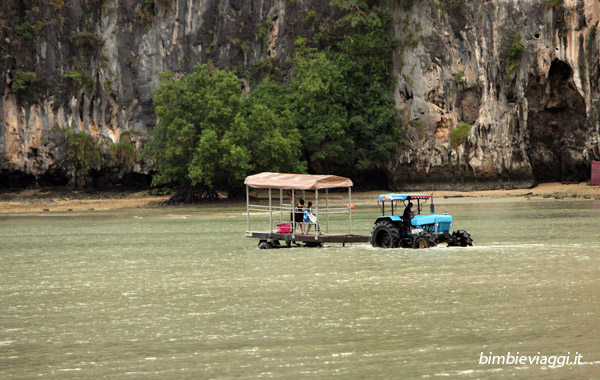 In alta stagione i traghetti si fermano a Railay west, in bassa stagione invece, per via delle maree, a Railay Est (per imbarcarsi da qui invece si utilizza un carretto trainato da un vecchio trattore arrugginito, i bambini ne vanno pazzi).