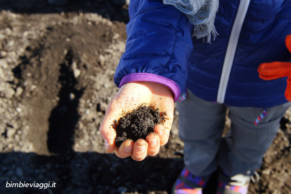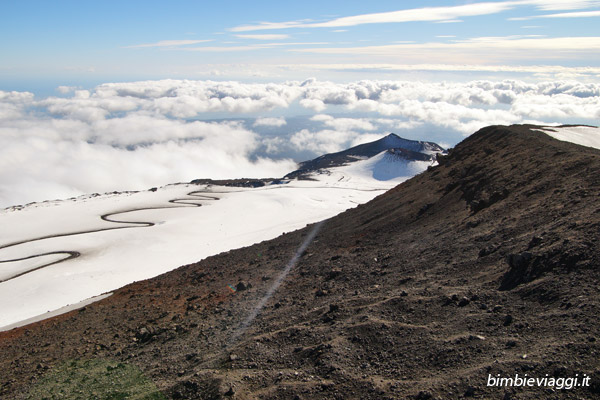 A proposito del clima, quando siamo saliti c’erano i residui di un’intensa nevicata di qualche settimana prima, ma le strade erano sgombre e solo in cima abbiamo camminato un po’ sulla neve ghiacciata. Nei giorni successivi, però, ha nevicato parecchio, quindi immagino che per salire e camminare sarebbe stato necessario essere attrezzati bene per la neve (qui qualche consiglio > consigli per vacanze sulla neve con bambini). Questo aspetto è da tenere in considerazione fino a primavera inoltrata. Telefonare a Funivie dell’Etna prima di ogni salita è sempre consigliabile per capire la situazione e organizzarsi di conseguenza. Come già detto nel precedente articolo, inoltre, alla stazione di arrivo della funivia è possibile affittare giacche e scarponi (3Euro al pezzo).