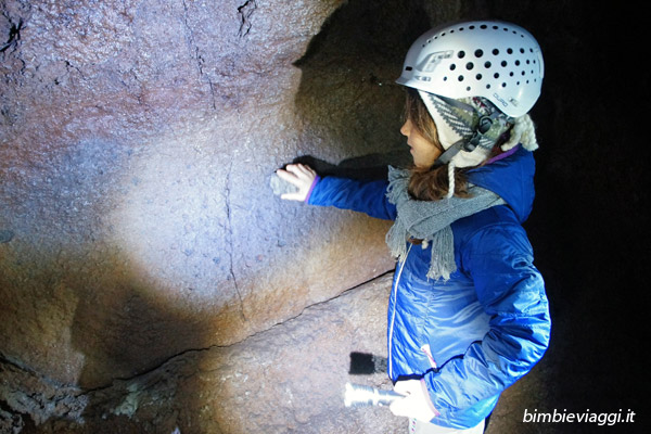 Armati di caschetto e torcia, siamo scesi quindi sotto terra e ci siamo addentrati per circa 100 metri in questo tunnel sotterraneo creato dalla lava: abbiamo provato il buio totale, visto da vicino quello che la lava è in grado di scolpire e imparato nuove cose sul mondo dei vulcani. Nei dintorni dell’Etna sono presenti numerose grotte di scorrimento lavico (sono 300 quelle censite, possono essere orizzontali o verticali, molte venivano usato in antichità come neviere) ma sono poche quelle che si possono esplorare in sicurezza.