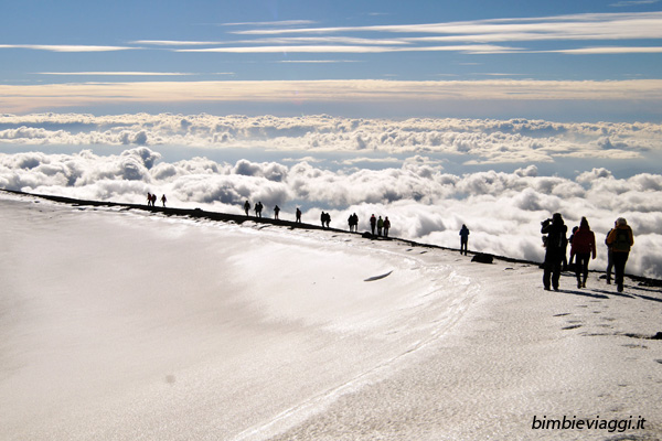Il paesaggio lassù è davvero incredibile: sotto di noi c’era un letto di nuvole, sopra le quali sbucavano solo i crateri e le cime più alte. E in alto i crateri attivi, con la punta giallo-zolfo e il fumo che usciva. Questa volta non eravamo attrezzati per salire ai sommitali, ma contiamo di tornare nella bella stagione per provare anche questa emozione. Si tratta di un’escursione suggerita dai 10 anni in su e possibilmente con un po’ di allenamento alle spalle. Assolutamente da fare con guide esperte, perché il vulcano non scherza.