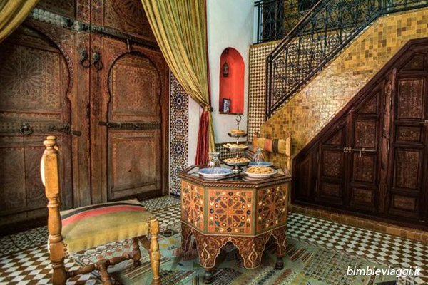 L’hotel che abbiamo scelto, il Palais De Fès Dar Tazi, è un tipico palazzo antico a conduzione familiare e infatti l’accoglienza è molto calorosa. Le stanze ci fanno subito immedesimare nella vita marocchina e dopo aver sistemato i bagagli, anche se tardo pomeriggio, decidiamo di immergerci subito della Medina e cercare un luogo per mangiare la sera.