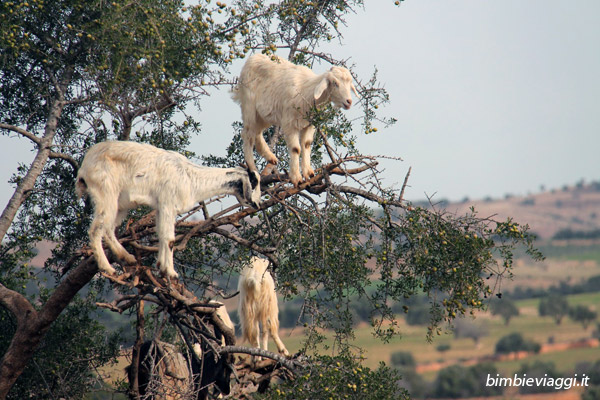 Decidiamo di spostarci verso la costa per una breve gita alla cittadina di ESSAOUIRA e durante il viaggio attraversiamo una zona particolare. Gli alberi di Argan che costeggiano la strada sono abitati da capre!!! Dopo esserci fermati e avvicinati abbiamo visto da vicino questo strano fenomeno: le capre si arrampicano sui rami alti anche 10 metri per mangiare le foglie ricche di acqua e frutti. Ovviamente questo attira tutti i turisti di passaggio oltre all’attenzione di Martina.