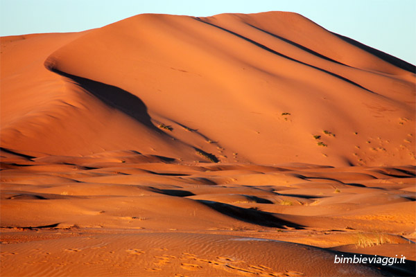 La nostra sistemazione è un accampamento di tende berbere nel mezzo delle dune di Erg Chebbi, con dune alte anche 160 metri formate dalla sabbia sahariana portata dal vento. Per arrivarci saliamo sui cammelli: Martina sta nel marsupio in braccio al papà.